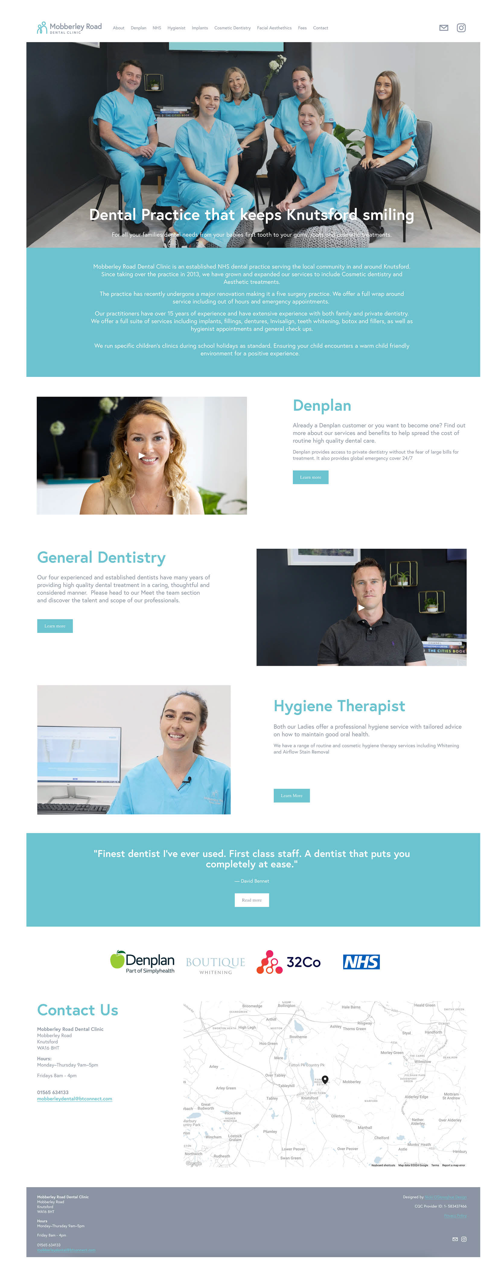 Branding Marketing Materials Website design Apparel Operating as an NHS dental practice since 2013, Mobberley Road Dental Clinic recently undertook an expansion to include cosmetic dentistry and aesthetic treatments. I was approached to create a brand that was still welcoming to its local NHS clients but would also be appealing to those seeking private treatments. It was important to the client that the logo didn’t alienate its current clientele of mainly families, but would attract new patients who weren’t just seeking dental care. I was originally asked to incorporate a family in the shape of a tooth into the logo but upon researching dental clinics I found that this approach had been done many times before which risked the brand becoming generic and forgettable. It would also be a confusing message to those seeking aesthetic treatments and could need rebranding if the clinic were to expand in the future. Therefore I took a different approach, creating a simple logo mark that represented the family and also the dentist and patient relationship. It also represents the M for Mobberley Road and can be interpreted as two teeth sitting next to one another. These multiple layers of meaning meant that clients can interpret the logo dependent on the service they were seeking and provides futureproofing for the business. I paired this simple logo mark with a clean but friendly font, and created a bright but simplified colour palette which elevates the brand to a premium level. Upon completing the branding I was then approached to create a website for the dental practice. This also needed to be clean and concise, introducing the practice in a friendly way but ensuring the breadth of the services offered were clear and easily found.